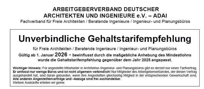 ARBEITGEBERVERBAND DEUTSCHER ARCHITEKTEN UND INGENIEURE e.V. - ADAI veröffentlichen wir die seit Jahren herausgegebenen unverbindlichen Gehaltstarifempfehlungen.